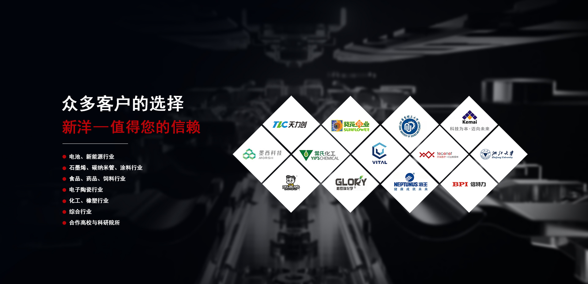 石墨烯、碳納米管、涂料行業 食品、藥品、飼料行業 電子陶瓷行業 化工、橡塑行業 綜合行業 合作高校與科研院所 電池、新能源行業